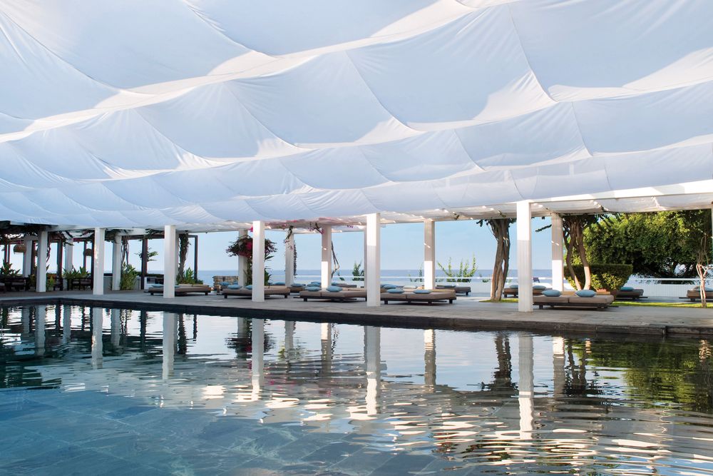 Bien à l'abri du soleil de midi, vous vous allongez à la piscine principale sous une protection solaire.