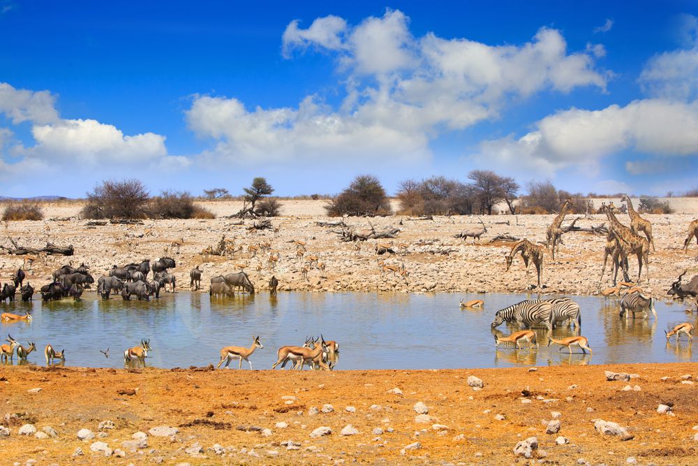 Dans le parc national d'Etosha, vous pouvez voir des éléphants, des zèbres, des gnous et des springboks.