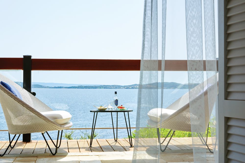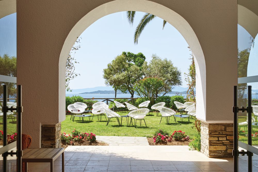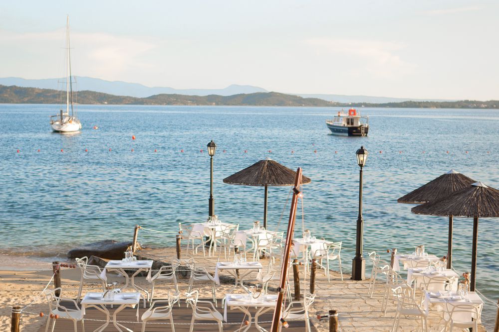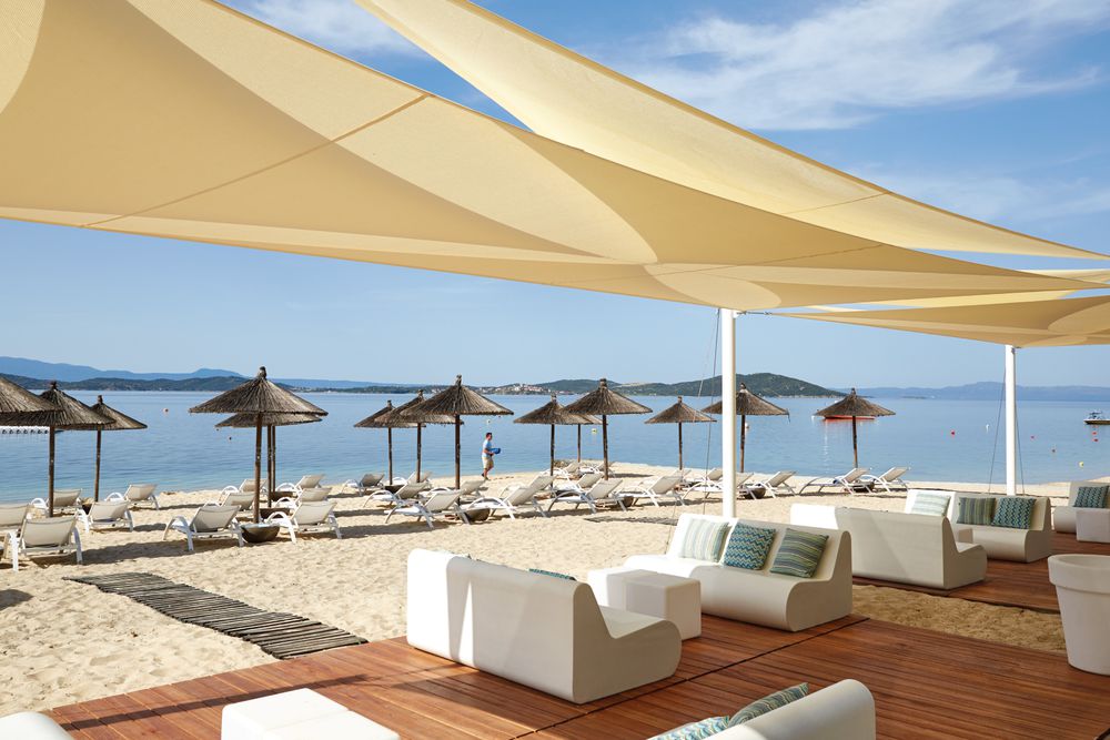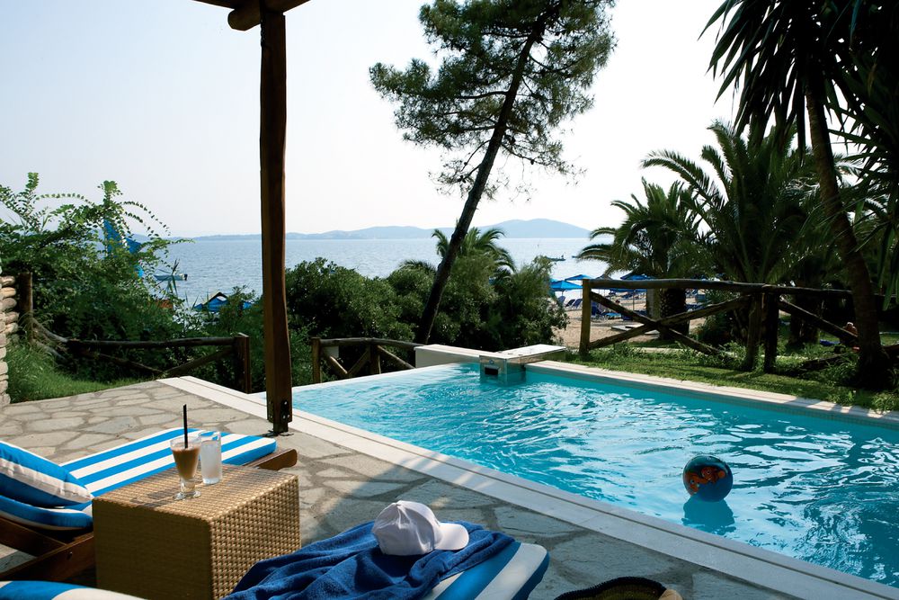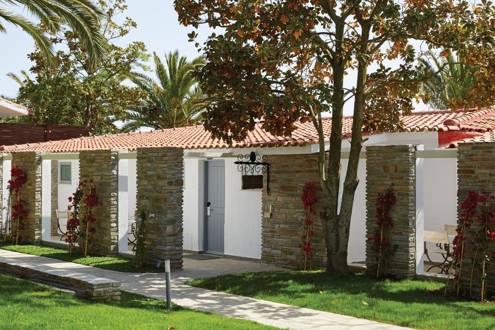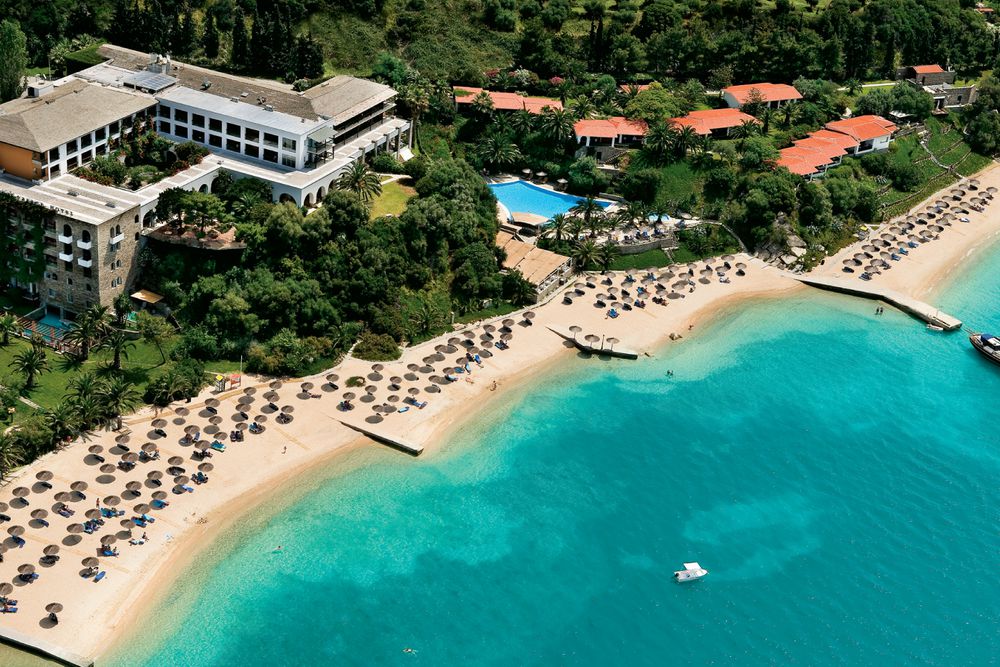 Les bungalows, les restaurants, les piscines et les terrasses en pierre s'intègrent parfaitement dans le paysage vallonné avec d'innombrables palmiers, oliviers et pins. L'hôtel, avec ses vues fantastiques sur le paysage côtier de l'île d'Ammouliani, met l'accent sur diverses mesures écologiques pour protéger l'environnement. Il s'agit notamment du changement variable du linge de lit, des lampes à économie d'énergie dans les lieux publics, du recyclage des piles et du filtrage régulier de l'eau de la piscine.