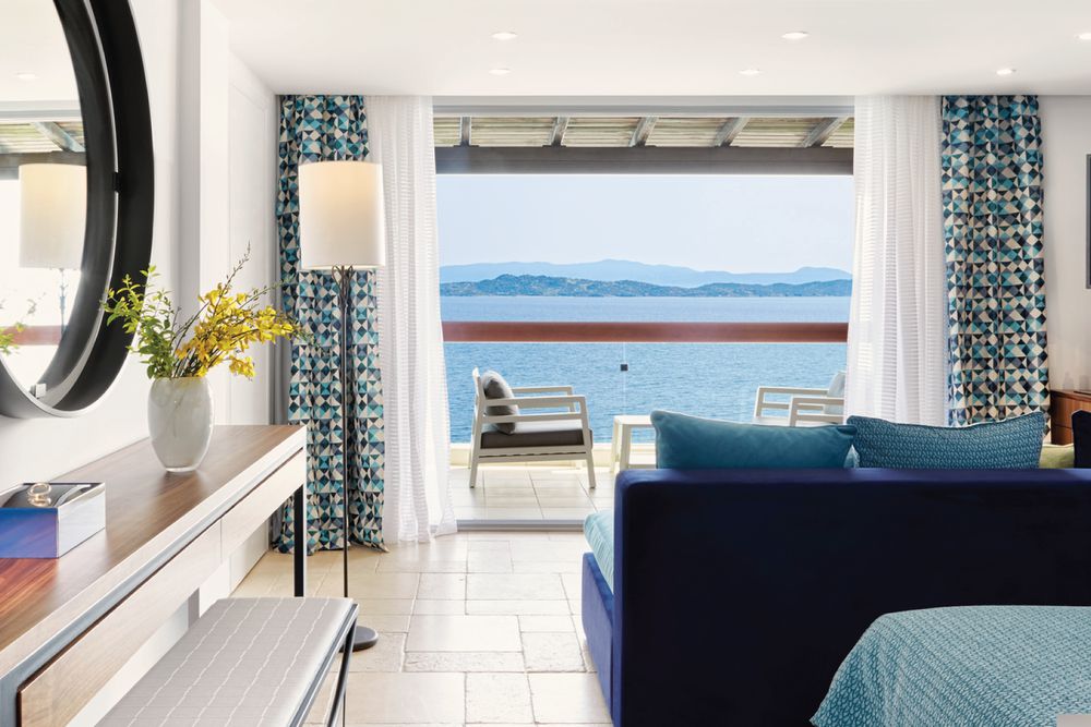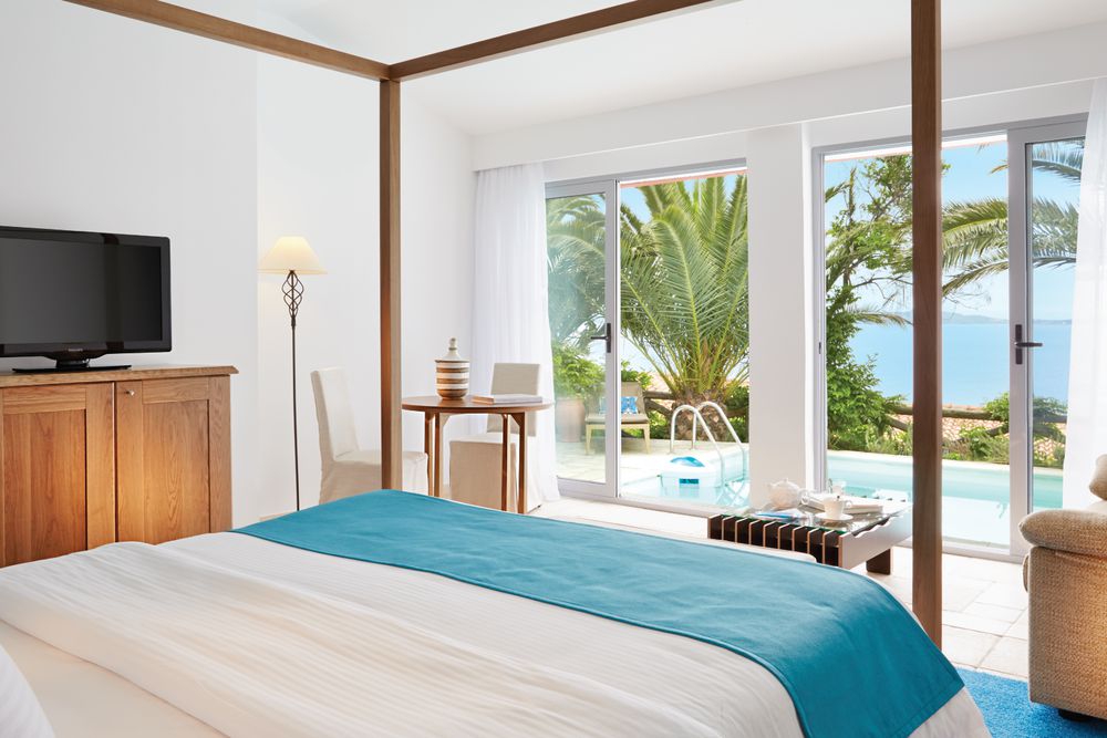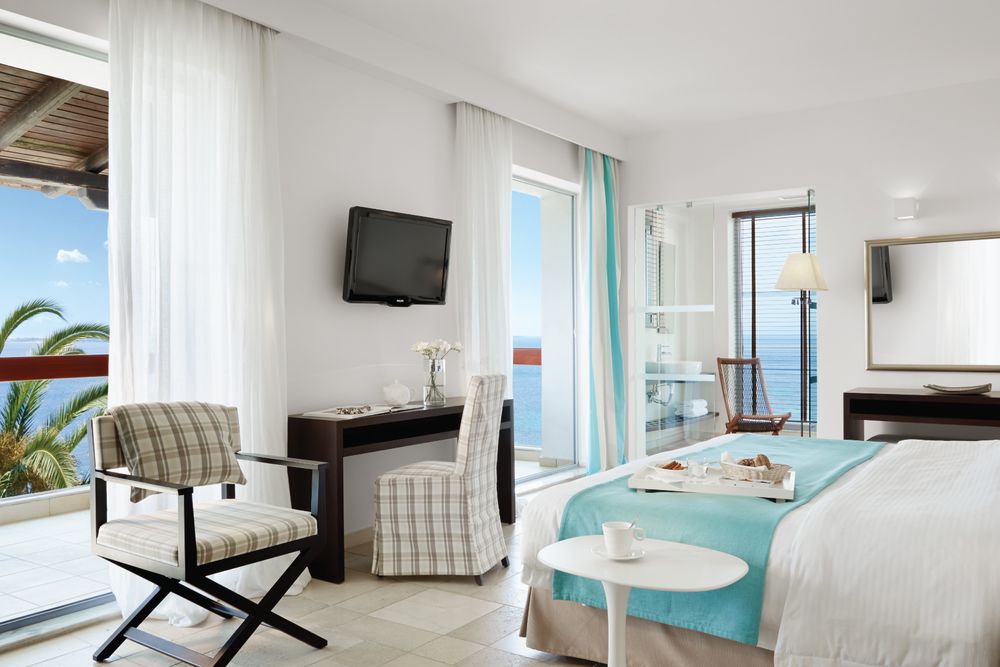 Toutes les chambres, avec vue sur la mer ou sur le jardin, sont équipées de deux lits ou d'un lit double, d'un coin salon confortable, d'un balcon ou d'une terrasse avec un mobilier luxueux, de la climatisation, d'une télévision à écran plat, d'un téléphone à ligne directe, de Wifi gratuit, d'un coffre-fort de chambre, d'un sèche-cheveux, de peignoirs moelleux, de pantoufles et de serviettes de plage ainsi que de produits de soins de qualité et d'un mini-bar.