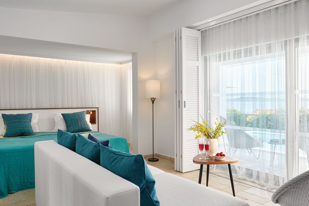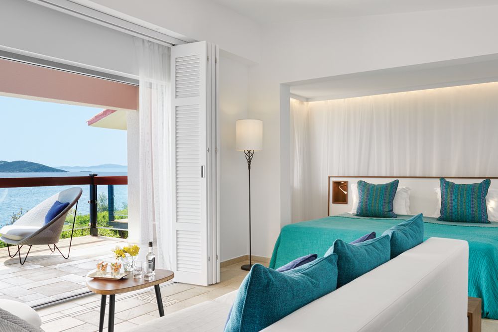 Junior Suite - d'une superficie d'environ 40 à 45 m², cet élégant logement offre également un coin salon et un grand balcon ou une terrasse avec vue sur la mer. Vous trouverez également une machine Nespresso ici. Deux des Junior Suites ont un jacuzzi privé. Maximum 2 adultes + 2 enfants ou 3 adultes + 1 enfant jusqu'à 11 ans.