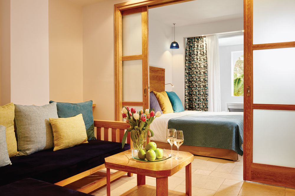 Suite familiale - environ 40 m², offre suffisamment d'espace pour les familles et possède une porte coulissante qui sépare la chambre à coucher avec lit double de la zone de séjour avec canapé-lit extensible. Maximum 2 adultes + 2 enfants ou 3 adultes + 1 enfant jusqu'à 11 ans.