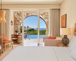 Premium Infinity Suite - environ 70 m², couleurs agréables, décoration moderne, piscines à débordement individuelles sur la terrasse, vue sur la mer.