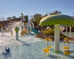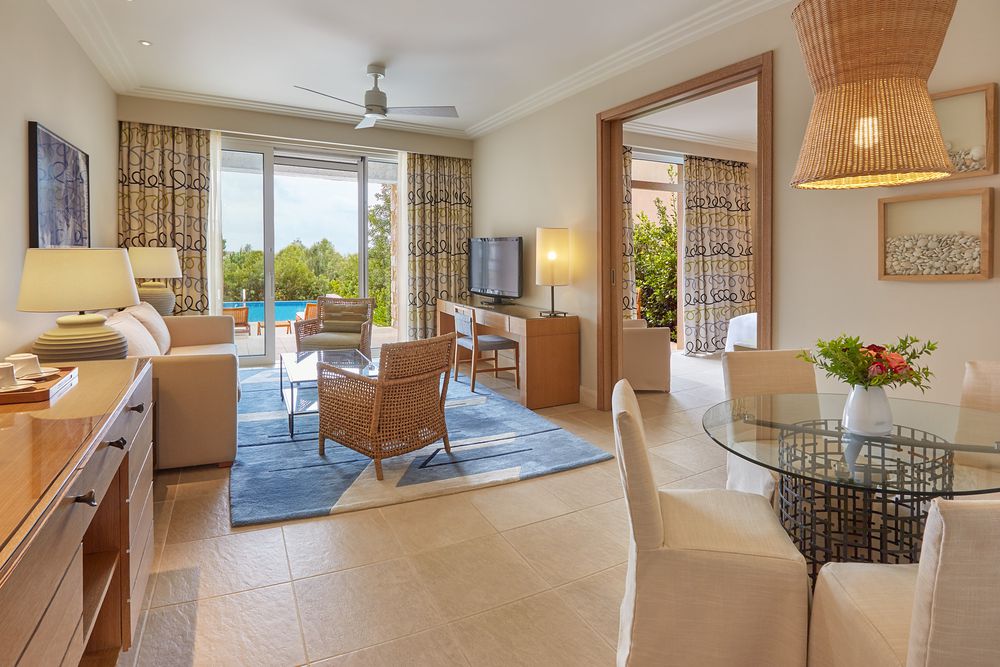 Family Suite - environ 70 m², chambre principale avec salle de bains attenante, vaste espace de vie avec deuxième salle de bains, grande terrasse, vue sur les jardins et les piscines de la station.