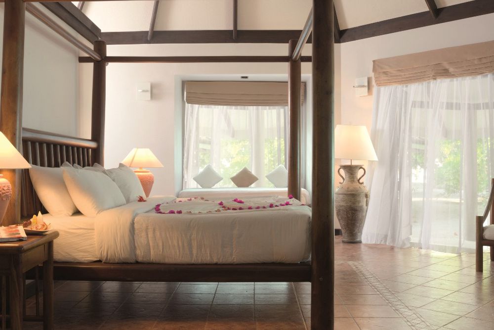 Les 124 villas sont peintes de couleurs vives et sont situées soit à l'intérieur de l'île, soit directement sur la plage, soit sur pilotis au-dessus de l'océan Indien. Chaque chambre est équipée d'un lit king-size et dispose d'une salle de bain spacieuse avec douche séparée, baignoire, produits de soins gratuits, sèche-cheveux et peignoirs. Un des points forts est la douche extérieure.