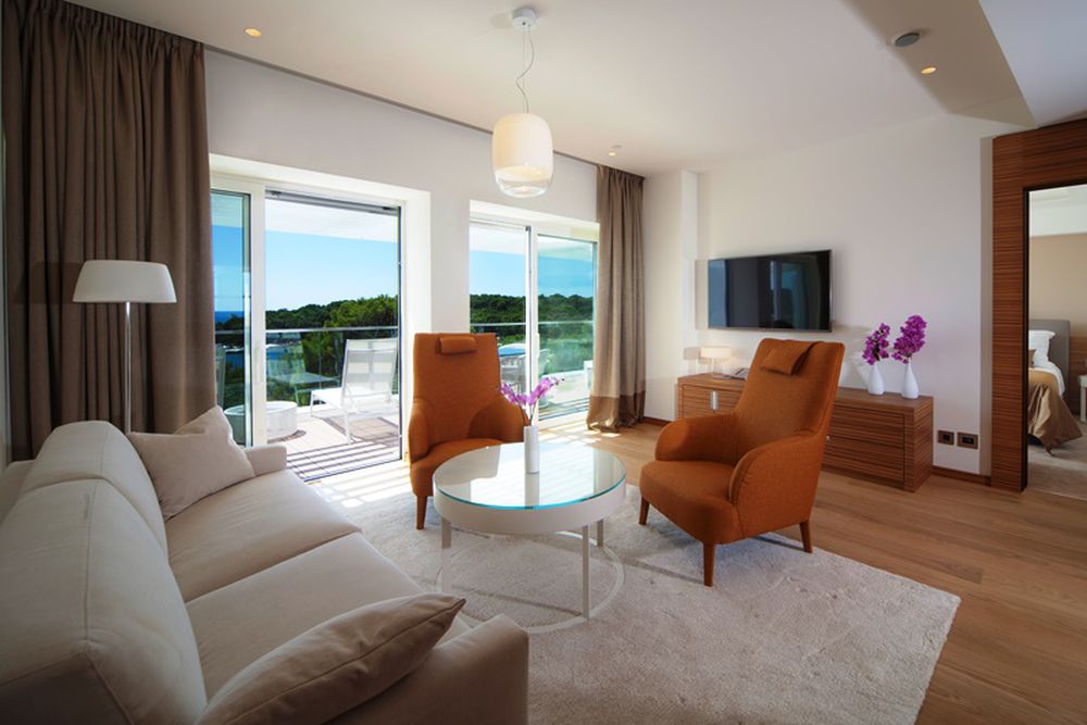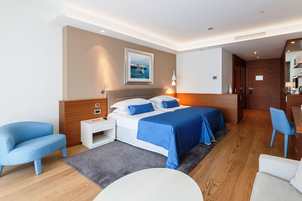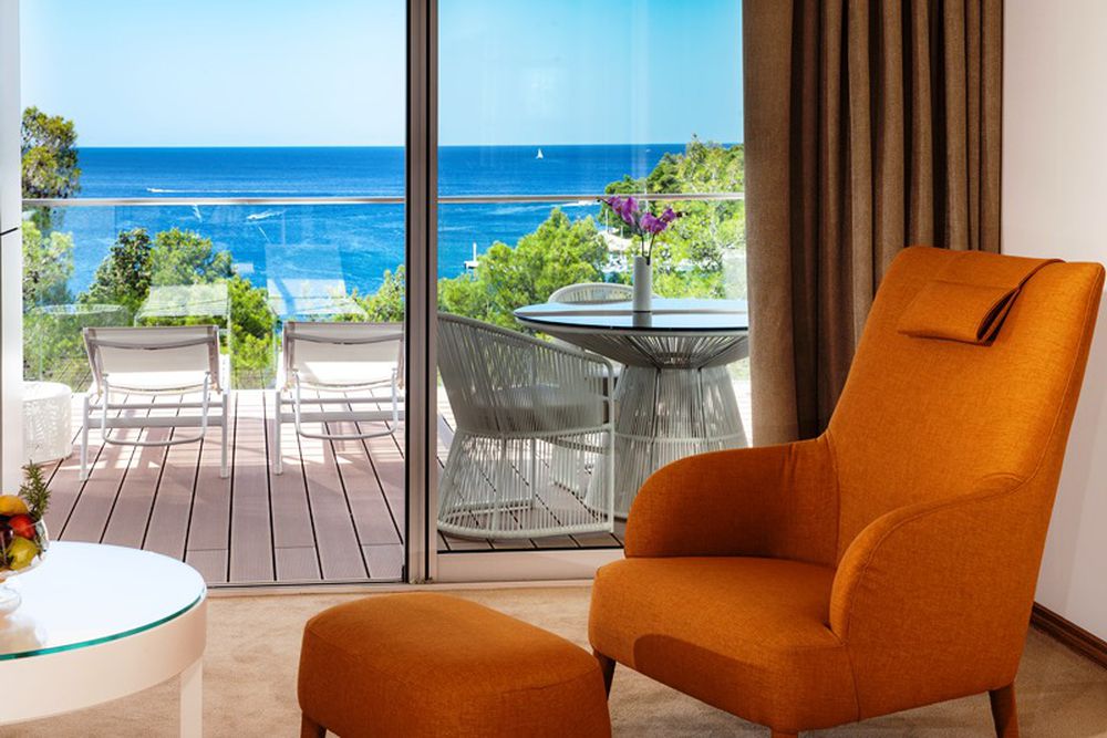 Deluxe Room - environ 38 m² de surface habitable + 22-26 m² de balcon. Les chambres doubles côté mer avec vue sur la baie de Cikat ou côté parc vers le parc forestier disposent d'une salle de bain avec deux lavabos et un sèche-cheveux. Sur le balcon, vous pouvez vous détendre en tant qu'invité sur les chaises longues et le canapé. Maximum 3 adultes.
