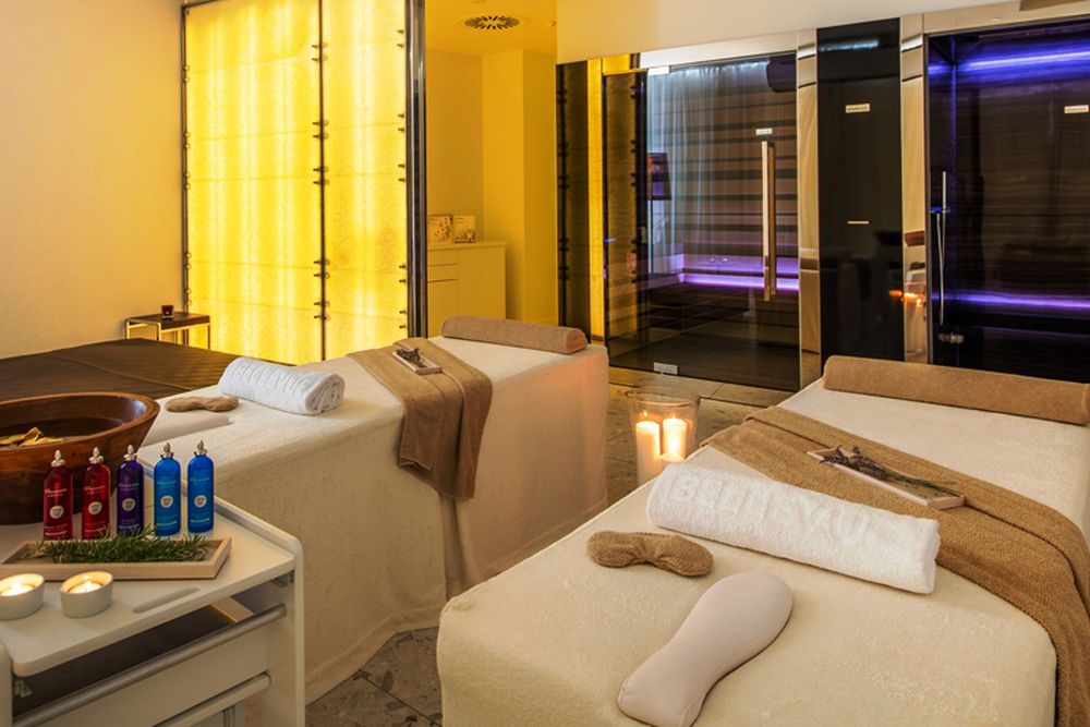 Suite Bellevue - environ 93 m² de surface habitable + 52-57 m² de terrasse. Les deux chambres doubles de la suite Bellevue ont deux entrées séparées, un salon commun, deux salles de bain, un dressing et une terrasse. Dans la salle de bains, vous trouverez deux lavabos, un bidet et un sèche-cheveux. Sur la terrasse, vous trouverez un jacuzzi, des chaises longues et un canapé. Maximum 6 adultes.
