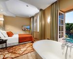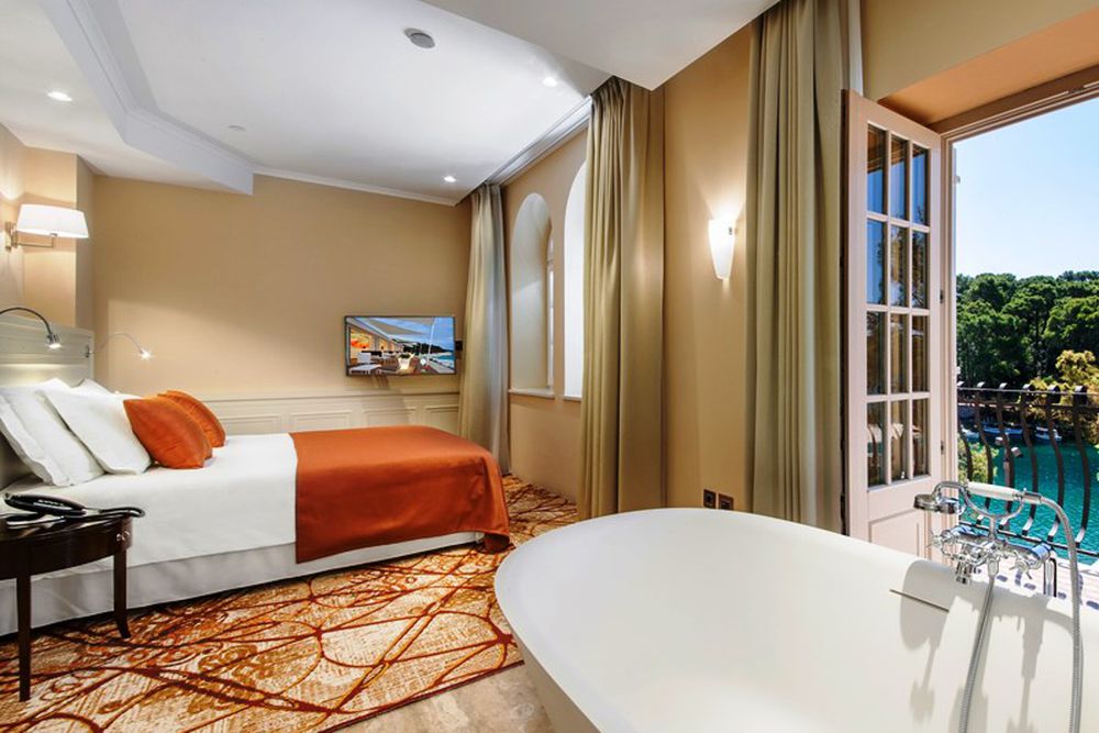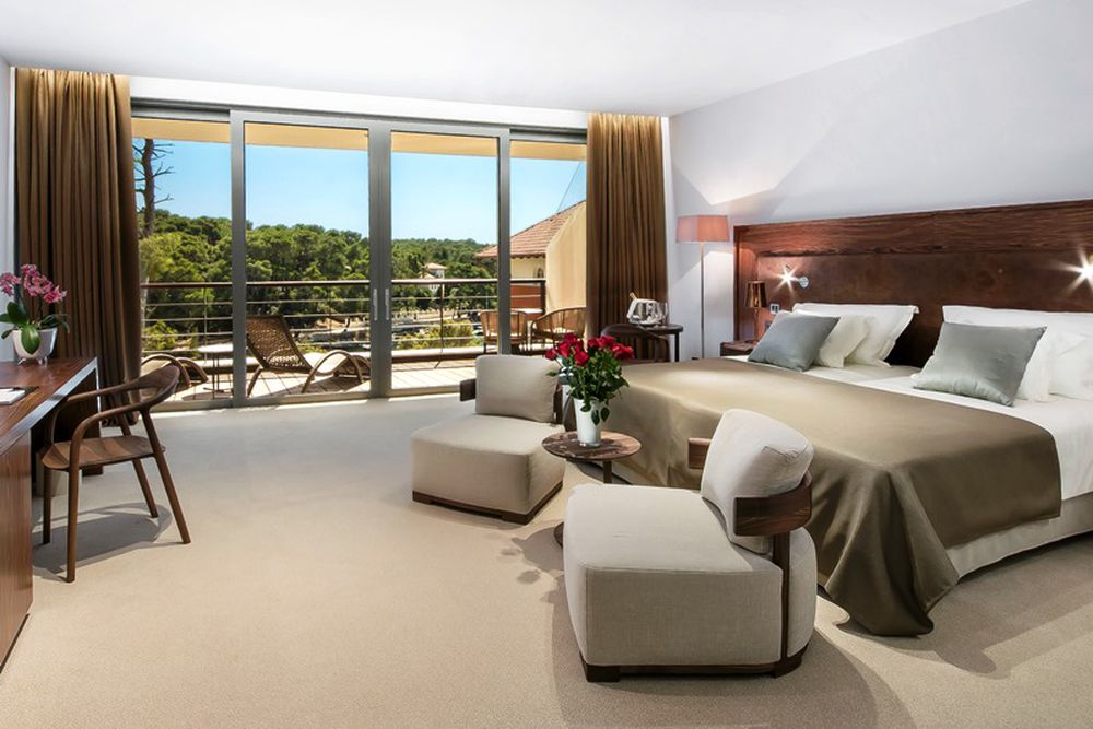 Deluxe Room - env. 32-52 m² habitables + balcon de 24 m², les chambres Deluxe avec balcon sont situées soit du côté de la mer avec vue sur la baie, soit du côté de la forêt. Le sol est recouvert de moquette, tandis que la salle de bains a une belle combinaison de pierre et de carreaux de mosaïque. Les salles de bains disposent également de douches et de baignoires (deux chambres n'ont qu'une seule baignoire, une chambre qu'une seule douche - accès handicapés), deux lavabos, un bidet et des produits de soins de jour. Sur les balcons recouverts de pierre ou de bois, il y a des suites avec chaise longue. Maximum 2 adultes.