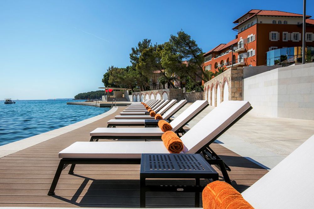 La plage privée, construite comme une route sur l'eau de mer claire, offre la toile de fond parfaite pour des moments de détente en bord de mer du printemps à la fin de l'automne. Lits de soleil, serviettes et parasols sont à votre disposition pour passer une journée de détente. Un escalier facilite l'accès à l'eau fraîche.