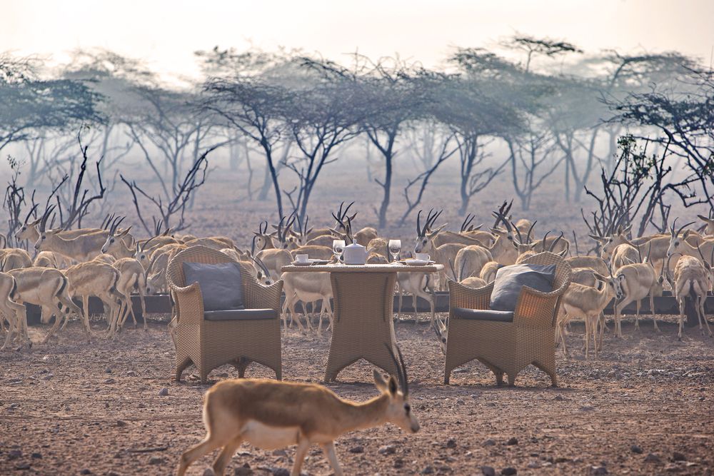 Anantara Desert Resort & Spa s'intègre parfaitement dans le paysage d'une île comme celle-ci, où l'expérience de la nature est au premier plan. Toute la station est ouverte, les animaux comme les antilopes ou les paons courent librement et sans timidité à travers la station. Le style et le design de l'hôtel sont un mélange approprié d'éléments africains et arabes, les parties du bâtiment se confondant presque avec la végétation de l'intérieur et de l'extérieur. Le grand hall d'entrée en forme de tente et le hall d'entrée meublé avec style créent une atmosphère familière et en même temps aventureuse. Bien sûr, la durabilité joue un rôle majeur dans un hôtel comme celui-ci, par exemple, les emballages en plastique sont presque totalement supprimés.