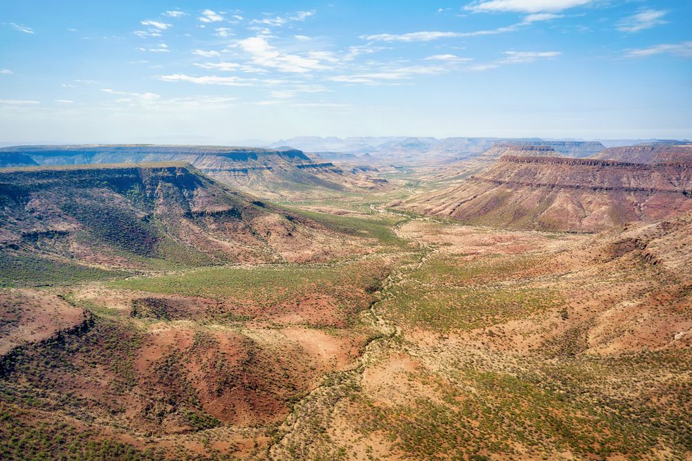 Après un dernier safari matinal, dirigez-vous vers la réserve naturelle de Palmwag, dans le nord du Damaraland. Le Damaraland est une région du nord-ouest de la Namibie, dont le nom remonte à Damara, un groupe ethnique africain dont la zone de peuplement principale est cette région. En début de soirée vous arrivez à Grootberg Lodge, votre hébergement pour les deux prochaines nuits. Majestueusementperché sur le plateau d’Etendeka, Grootberg Lodge offre une vue magnifique sur la vallée de la rivière Klip.