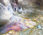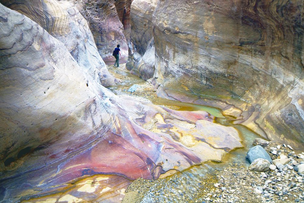 Le sol riche en minéraux fait briller les lits des rivières de Wadi Dana dans différentes couleurs.