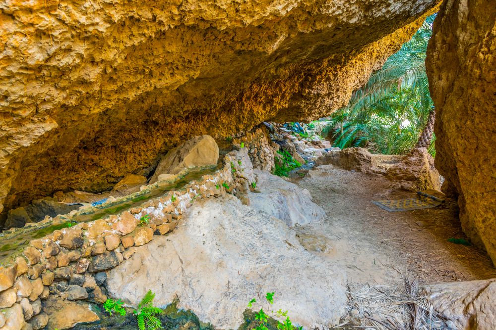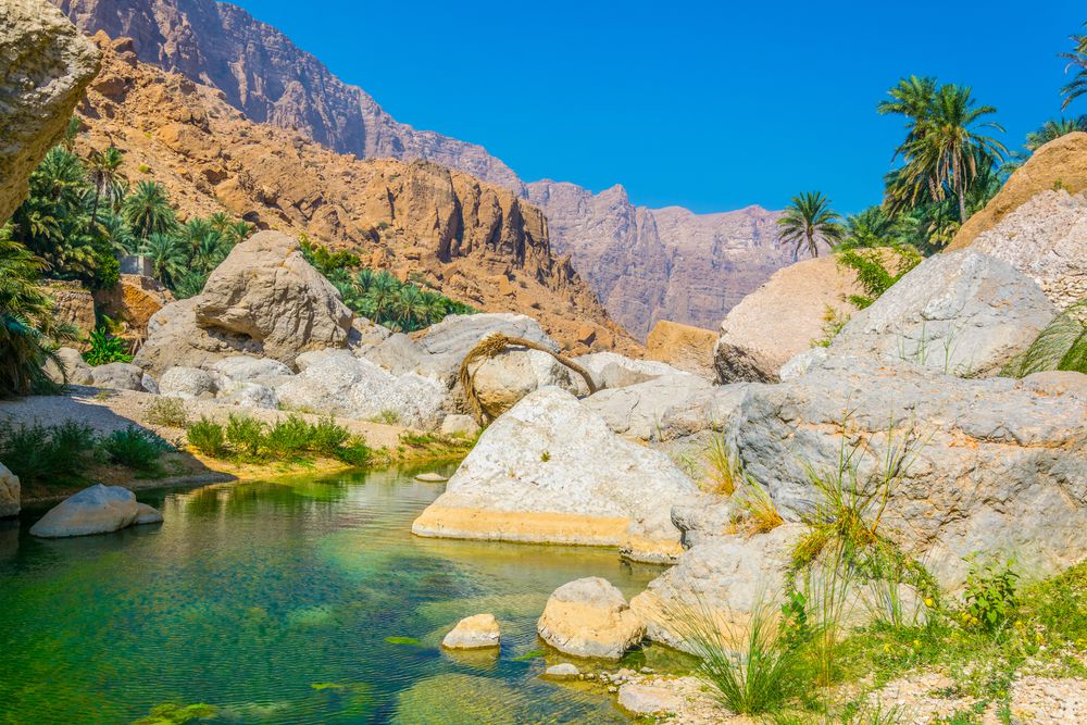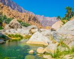 Les contreforts orientaux des montagnes du Hajar abritent également une poignée d'oasis de montagne, appelés oueds. Surtout en hiver et au printemps, elles sont alimentées par les pluies des montagnes et la montée des eaux souterraines et fleurissent d'un vert luxuriant. À Wadi Tiwi, vous pouvez explorer le paysage contrasté en vous promenant dans des eaux peu profondes.