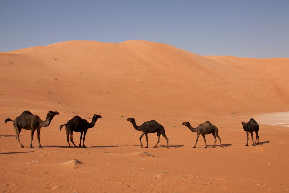Après environ 200 kilomètres, vous atteindrez le campement bédouin d'Al Hashman. Cette petite ville frontalière est située à la limite sud du Rub Al Khali et constitue la porte d'entrée du désert par le sud. La colonie est habitée en permanence depuis des siècles et a toujours été une étape bienvenue sur le chemin entre la riche Salalah au sud et les colonies au nord. Les gens qui y vivaient ont toujours élevé des chameaux noirs extrêmement rares, qui constituaient la base de leur subsistance et le font encore aujourd'hui. C'est exactement cette ferme que vous visiterez et que vous apprendrez de première main sur l'élevage, les soins et les caractéristiques de ces animaux robustes.